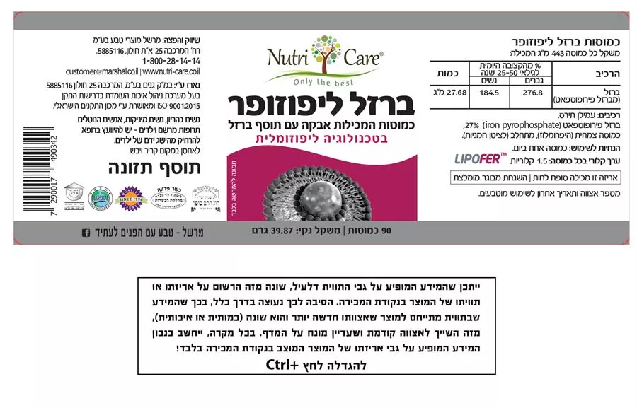 ברזל ליפוזומלי Ferric pyrophosphate | 27 מ"ג |